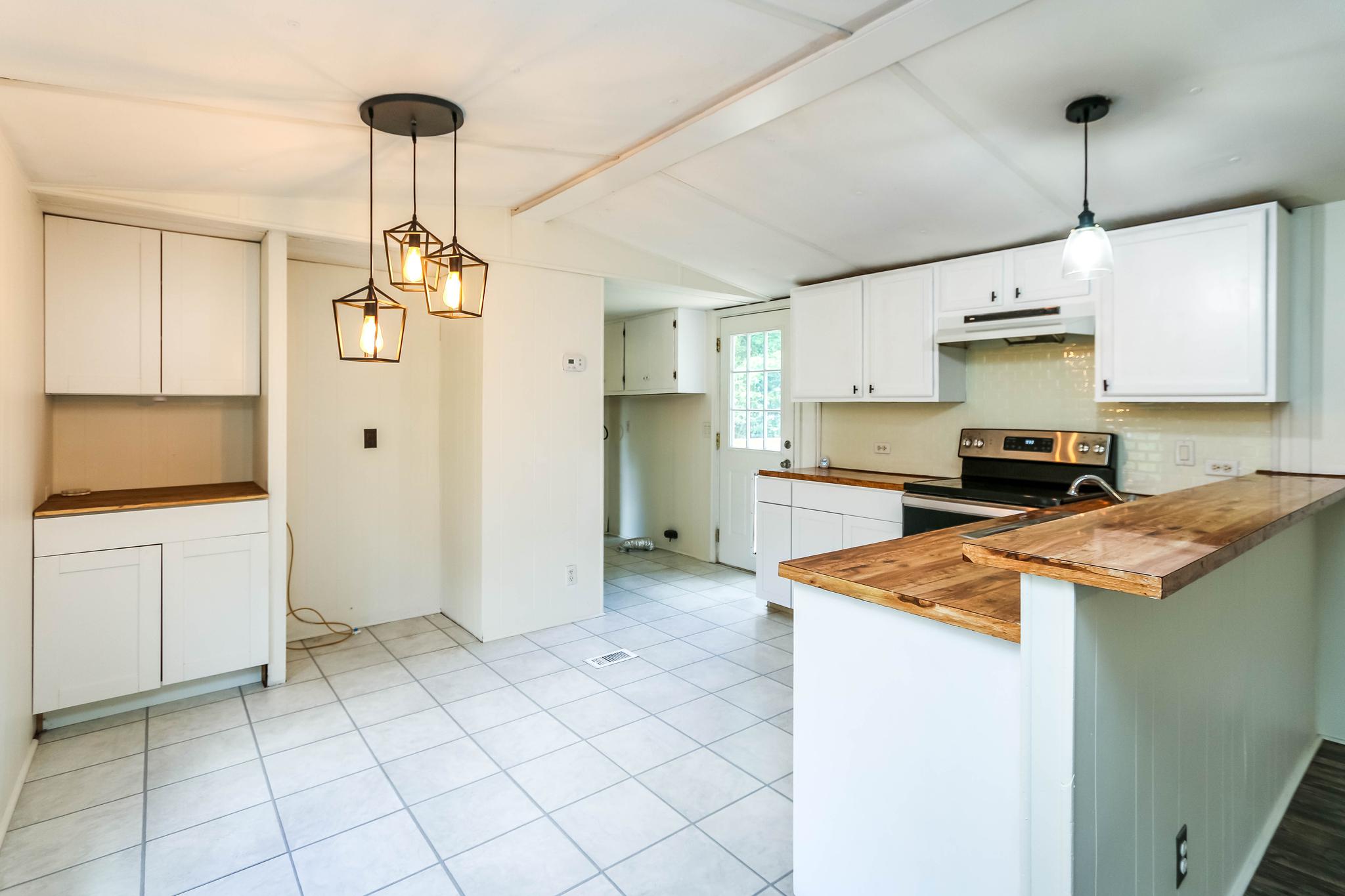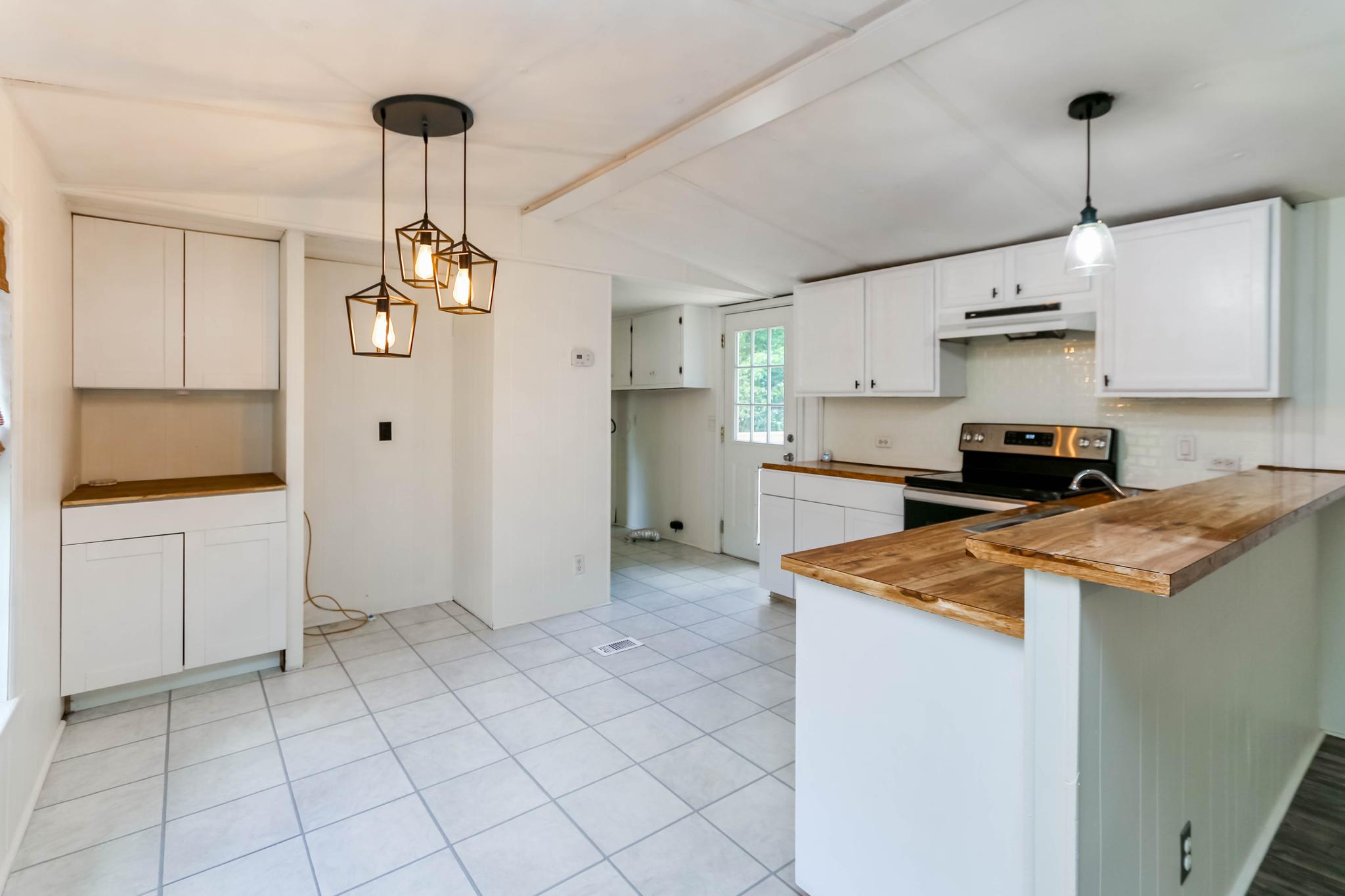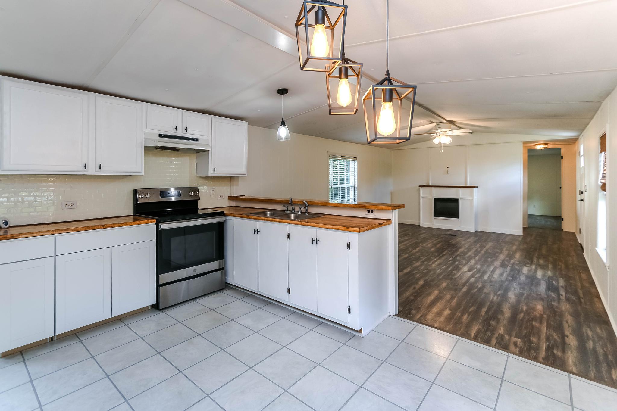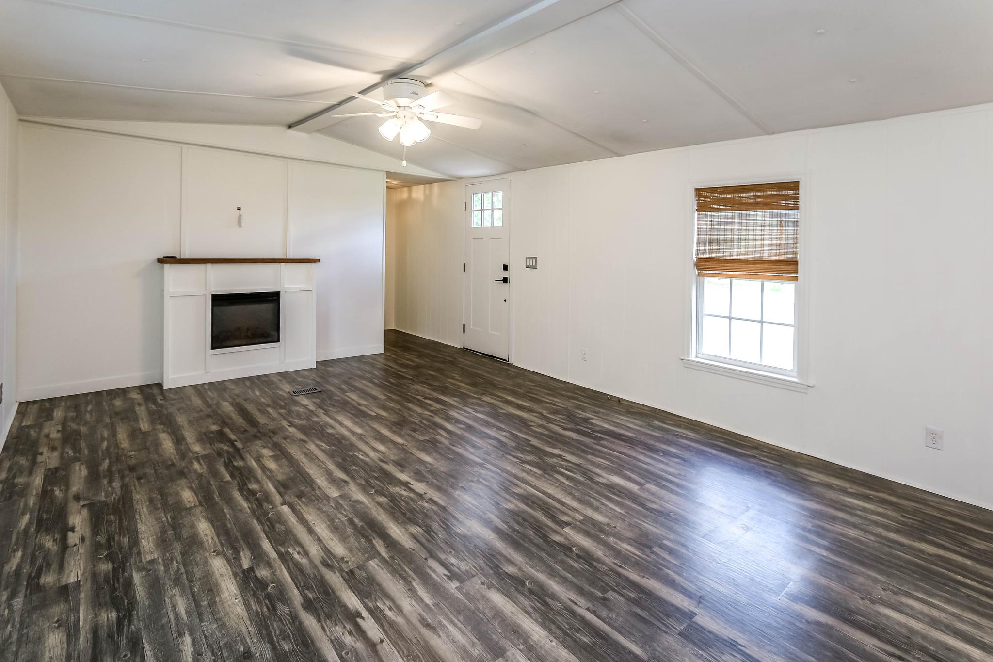This home features a one-level open floor plan, multiple new decks, two bedrooms, two full bathrooms, an eat-in kitchen with new lighting, a coffee bar, washer and dryer hookups, an electric fireplace, and new LVP flooring.